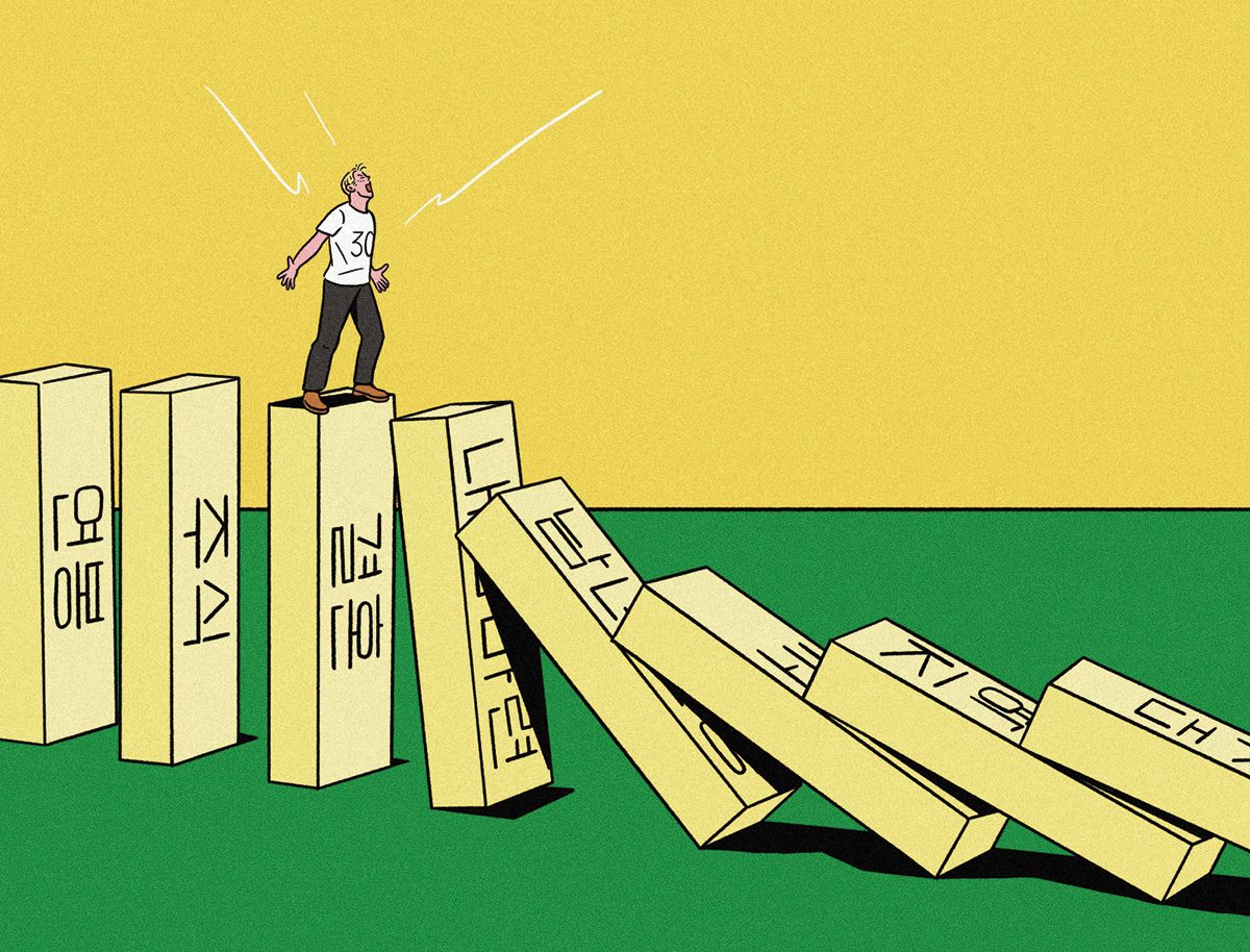 지금의 30대들이 어디선가 갑자기 튀어나온 사람들은 아니다. 우리는 1980~1990년대에 태어났고, 2000년대 금융위기와 2020년대 팬데믹을 거쳐 2024년 마침 한국 사회에서 30대로 살아가고 있을 뿐이다. 그리고 다들 알다시피 지난 20년 사이 가장 큰 화두는 두 가지, 부동산과 일자리였다. 2000년대 이후 주택 가격은 솟구쳤고, 2010년대부터 실업률까지 크게 증가했다. 쉽게 말하면 우리는 소득 및 자산의 격차가 가속화되는 시기에 사회에 발을 디딘 이들이다. 이를 너무 명확하게 보여주는 언어적 현상이 있다. 지금은 너무나 익숙해진 ‘취준생’ ‘흙수저’ 등의 신조어들은 모두 우리가 20대를 거치는 시기에 탄생했다. 반대로 말하면 ‘준비생’을 거치지 않고 취업을 할 수 있었던, 또 ‘수저’ 없이도 미래를 그릴 수 있었던 세상은 2010년대에 이미 막을 내리고 있었다는 이야기다.