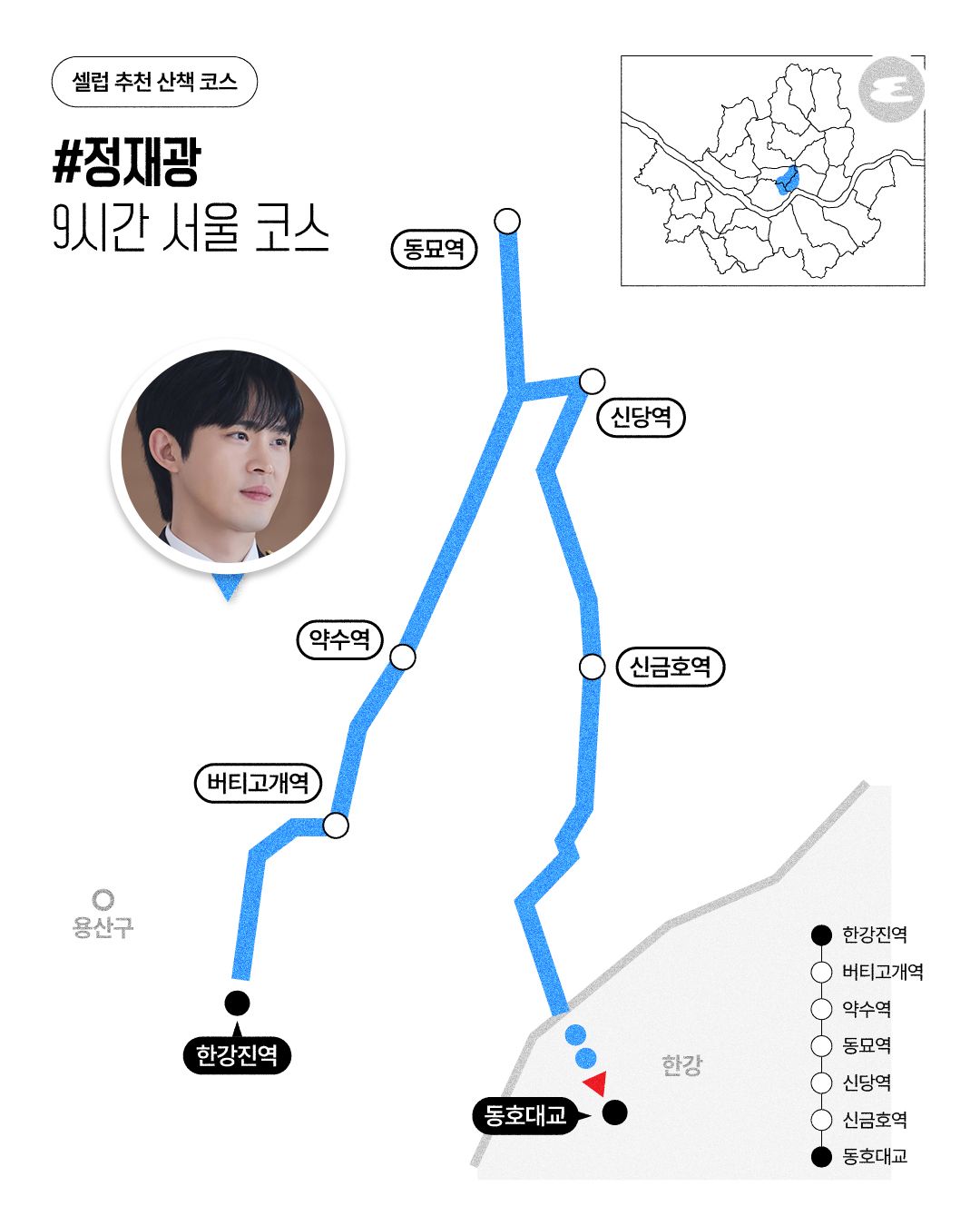 9시간 서울 코스 | 한강진역 > 버티고개역 > 약수역 > 동묘역 > 신당역 > 신금호역 > 동호대교