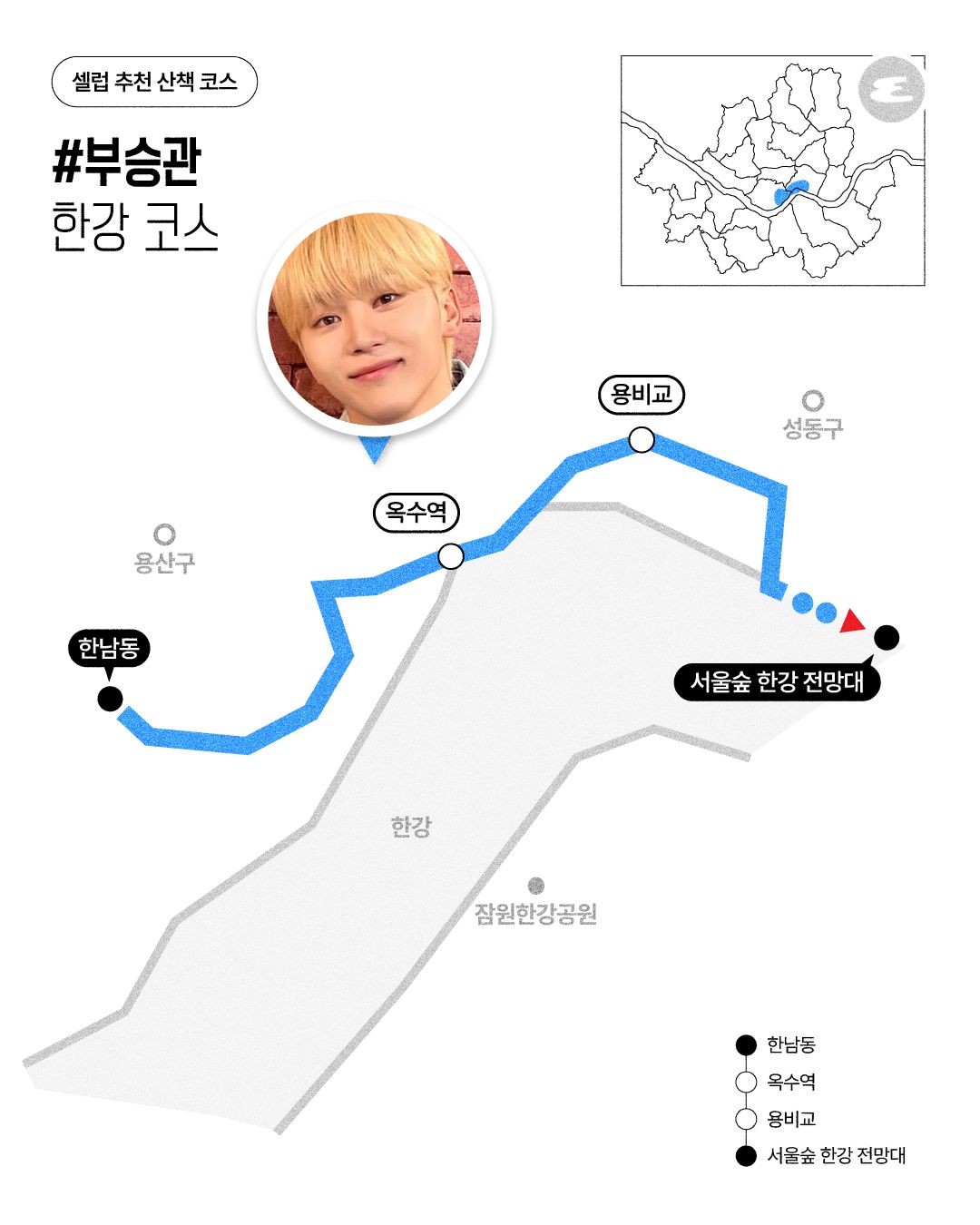 낮에는 따뜻한 햇볕이 내리쬐고 밤에는 선선한 바람이 부는 바로 지금, 산책하기에 완벽한 날씨입니다. 산책하는 습관은 건강에도 좋을뿐더러, 묵혀있던 고민을 덜어주고 새로운 기분을 느끼게 해주죠. 세븐틴 승관은 최근 라이브 방송을 통해 팬들에게 한강을 산책하는 모습을 실시간으로 보여줬어요. 이처럼 셀럽들이 걸었던 산책 코스를 소개합니다. 다음 주 주말, 아래 코스대로 걸어보는 건 어떨까요?