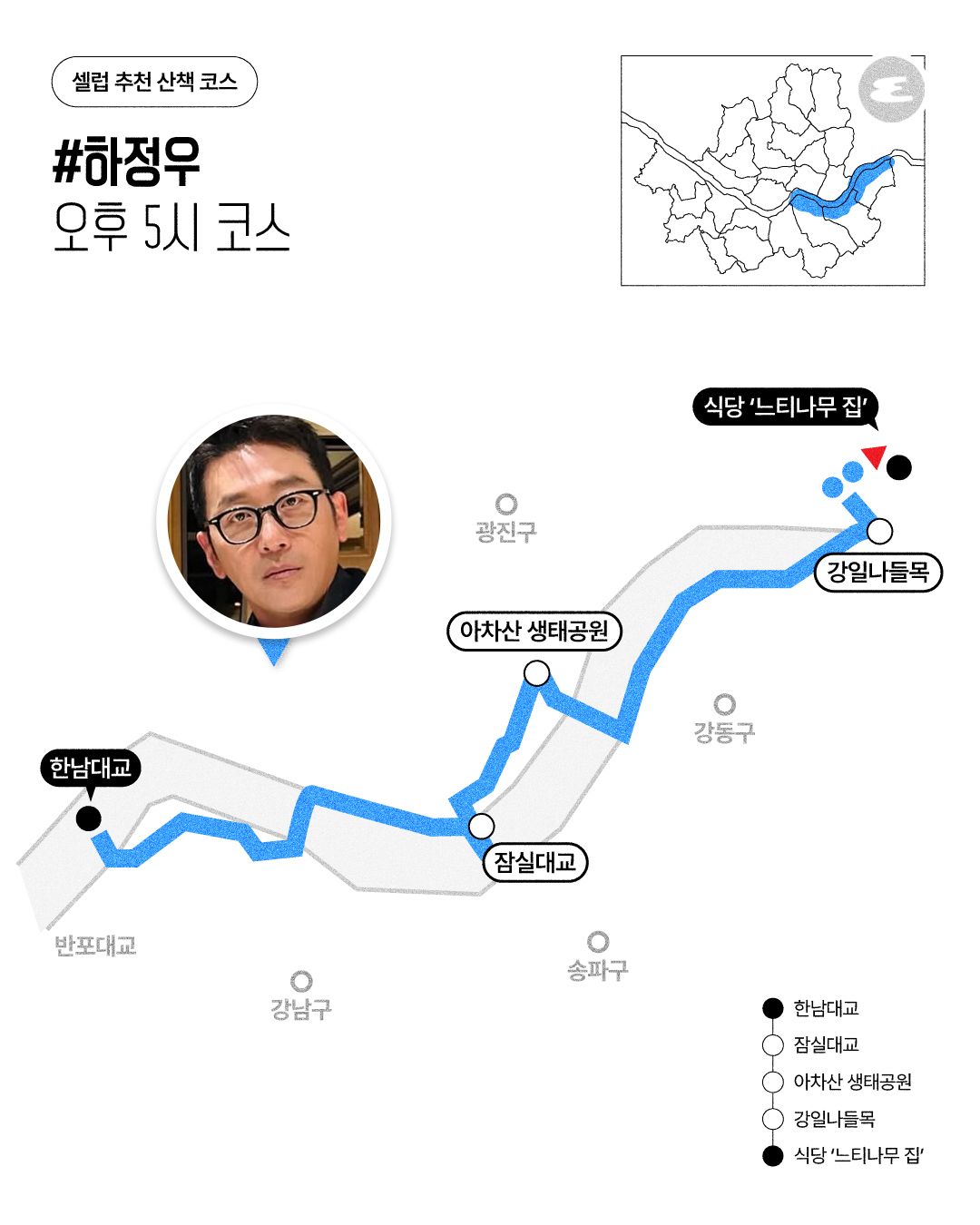 오후 5시 코스 | 한남대교 > 잠실대교 > 아차산 생태공원 > 강일나들목 > 식당 ‘느티나무 집’
