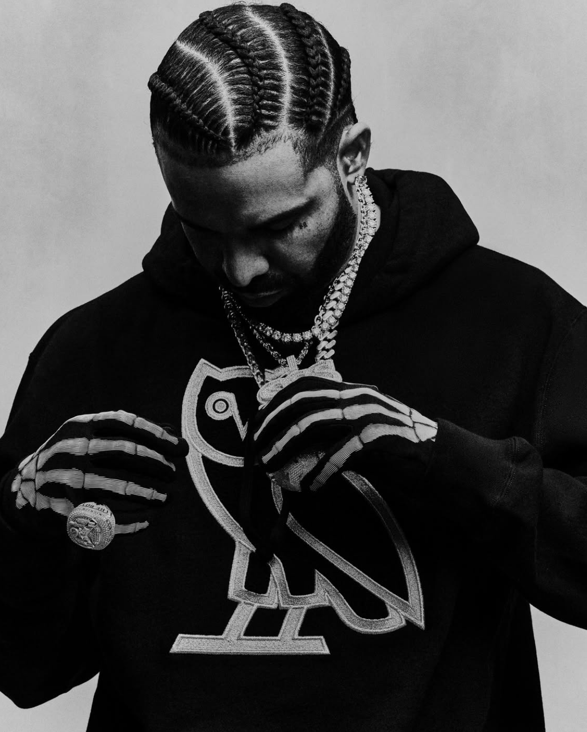 ‘OVO(October’s Very Own)’의 브랜드명은 드레이크의 생일인 10월 24일에서 유래되었습니다. 스트리트 웨어 브랜드로 올빼미 모양의 로고가 시그니처이며, 토론토 감성과 미니멀한 디자인이 특징이죠.