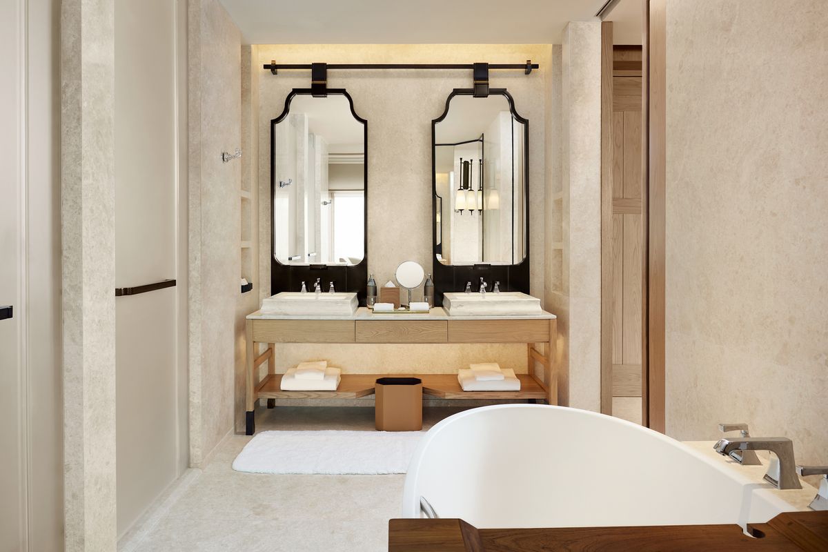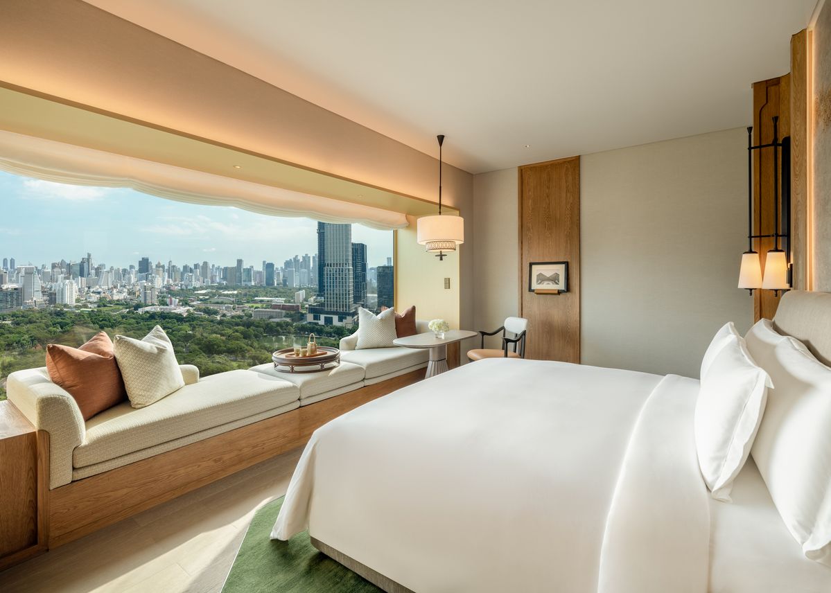 두짓타니 방콕의 가장 인상적인 특징은 257개의 모든 객실에서 룸피니 공원 전망을 마주할 수 있다는 점이다. 금빛 마감의 대형 창은 객실을 하나의 ‘황금 액자’처럼 만들며, 공원의 녹음이 실내 공간으로 자연스럽게 스민다. 기존 517개 객실을 257개로 줄여 최소 50㎡ 이상의 넓은 객실 구성을 확보했으며, 캔틸레버 창가에 앉아 방콕 도심의 녹음을 가장 가까이서 감상할 수 있도록 디자인했다. 이 밖에도 스파, 5,000㎡ 규모의 회의·연회 공간, 천장 높이 8m의 대형 볼룸 등 도심형 호텔로서의 완성도도 높였다.