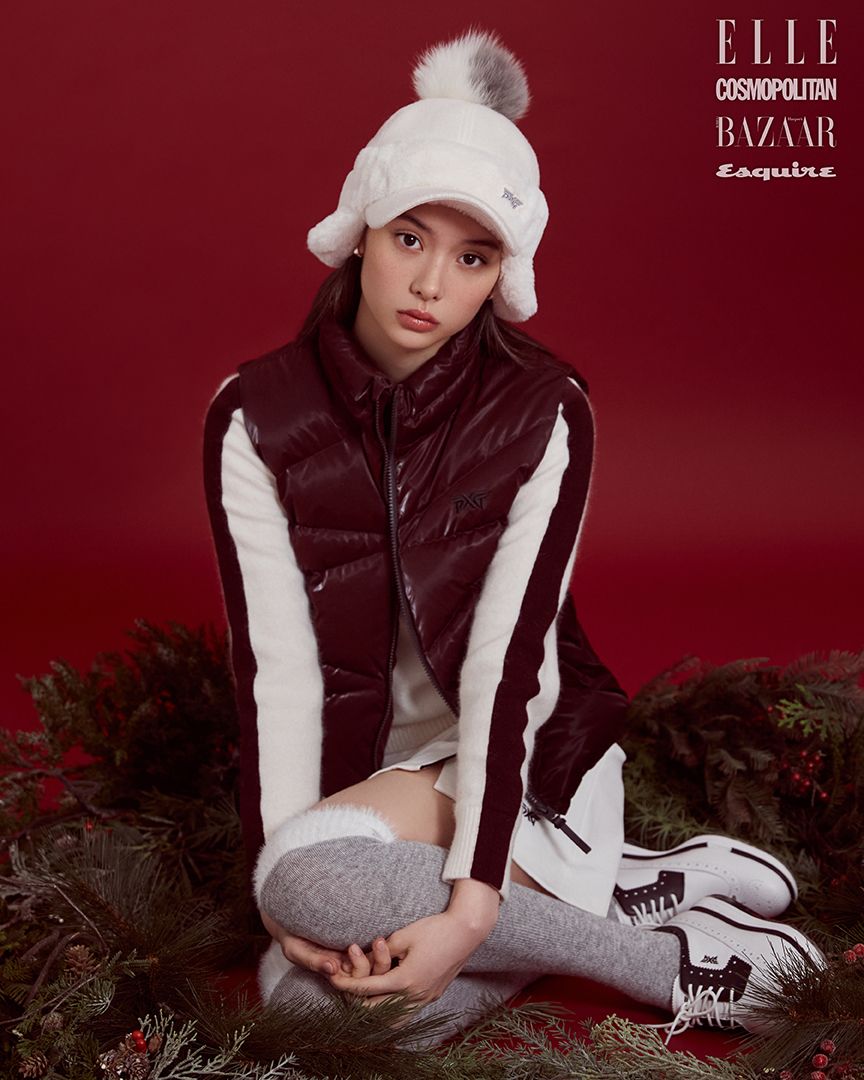 필드 위, 자신감을 더해줄 골프 웨어. 푸퍼 다운 베스트는 73만9천원, 윈드프루프 뉴 하이 넥 스웨터는 59만9천원, A라인 랩스커트는 49만9천원, 퍼 이어머프 모자는 19만9천원, 화이트 퍼 디테일의 오버 니삭스는 5만9천원, 오리지널 투어 스파이크 골프 슈즈는 45만9천원 모두 PXG.