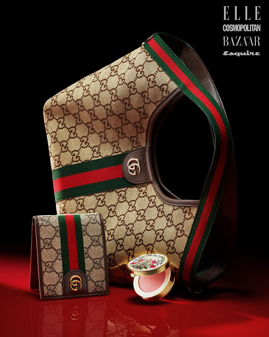 GG 캔버스 소재에 트리밍을 더했다. 베이지와 다크 브라운 컬러가 조화를 이루는 구찌 질리오 스몰 토트백은 2백86만원, 오피디아 반지갑은 76만원 모두 Gucci. 브라이트 코럴 컬러의 플로라 블러시 드 보떼 치크 앤 아이 파우더는 7만9천원 Gucci Beauty.