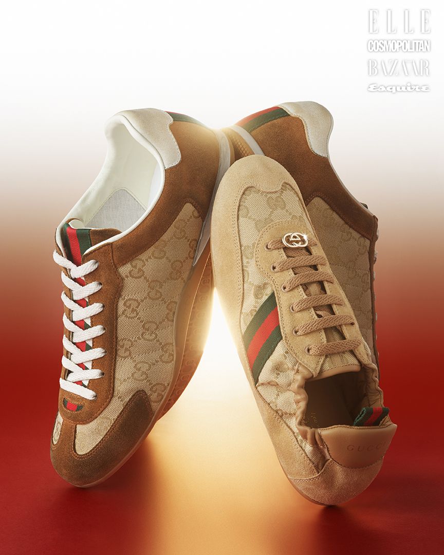 아이코닉한 패턴과 스웨이드 트리밍 디테일이 조화를 이룬다. 브라운 컬러의 GG 캔버스 남성 구찌 시프트 스니커즈는 1백44만원, 라이트 베이지 GG 캔버스 여성 구찌 시프트 스니커즈는 1백35만원 모두 Gucci.