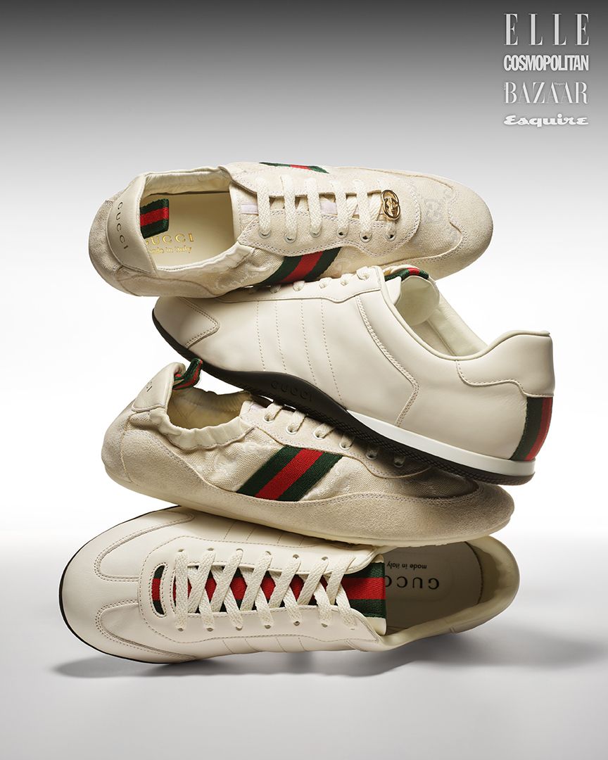 화이트 컬러 스웨이드와 레더에 시그너처 웹 디테일을 더한 디자인이 인상적이다. 화이트 컬러 GG 캔버스 여성 구찌 시프트 스니커즈는 1백35만원, 레더 소재의 남성 구찌 시프트 스니커즈는 1백44만원 모두 Gucci.