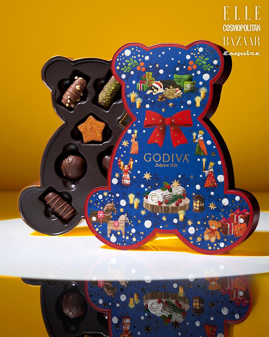 귀여운 곰돌이 모양 패키지에 부쉬 드 노엘을 모티프로 한 시즌 한정 초콜릿으로 가득 채운 부쉬 드 노엘 베어 셀렉션 7개입은 5만원 GODIVA.