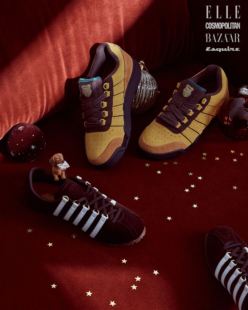 스웨이드 질감과 머스터드, 브라운 계열의 컬러 조합이 매력적인 KSRC 크슈타트 골드 스니커즈는 19만8천원, F/W 시즌에 잘 어울리는 컬러의 KSRC 비포 더 클래식 스니커즈는 19만8천원 모두 K-SWISS.