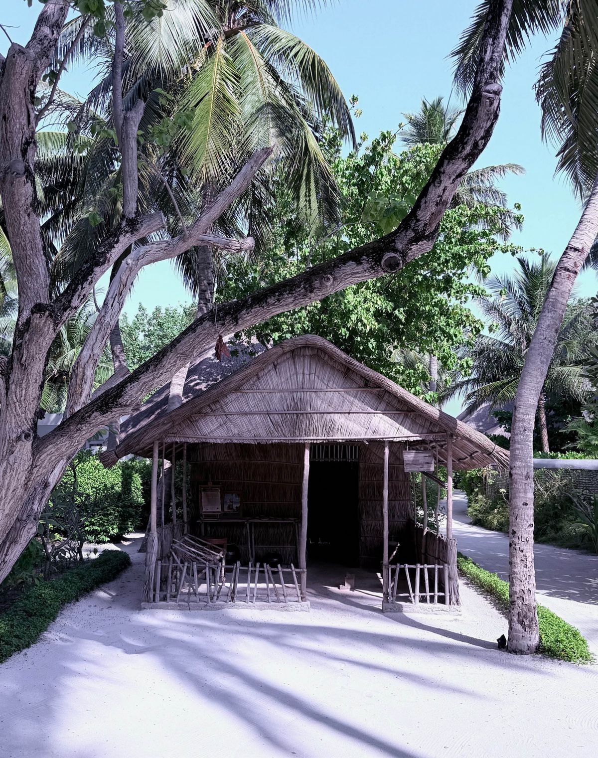 방갈로 바로 옆 길가에는 전통 몰디브 오두막이 하나 남아 있다. 나무판자 몇 장과 가로대, 그리고 야자잎으로 얹은 지붕. 이 오래된 건물과 고급 방갈로가 만들어내는 대조는 몰디브와 그 나라 사람들이 얼마나 많은 것을 해냈는지, 그 눈부신 변화를 증언하는 하나의 오브제다.