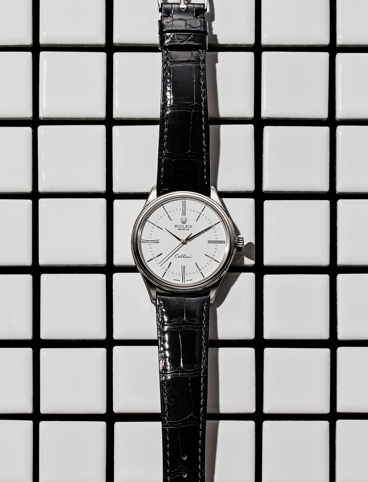 드레스 시계의 본질적 매력은 고급 소재와 단정한 다이얼 레이아웃이다. 롤렉스는 어떤 시계든 장르 문법을 벗어나지 않는다. 첼리니는 화이트 골드 케이스 안에 흰색 래커를 칠한 다이얼을 넣고 막대기 모양의 바 인덱스로 시간에 구획했다.