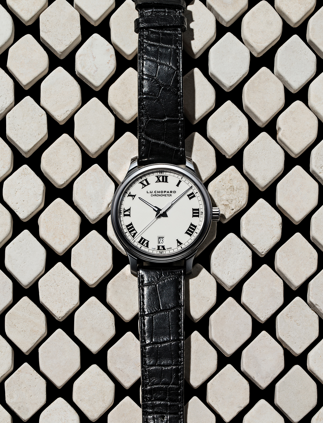 중세 서양의 검처럼 각을 많이 준 시침과 초침은 아무 브랜드나 만들 수 없다. 미세하게 노란빛이 도는 흰색 다이얼 역시 도자기를 만드는 방식으로 구워 만들었다. 이렇게 정성을 들인 시계에 L. U. C라는 이름을 붙인다.