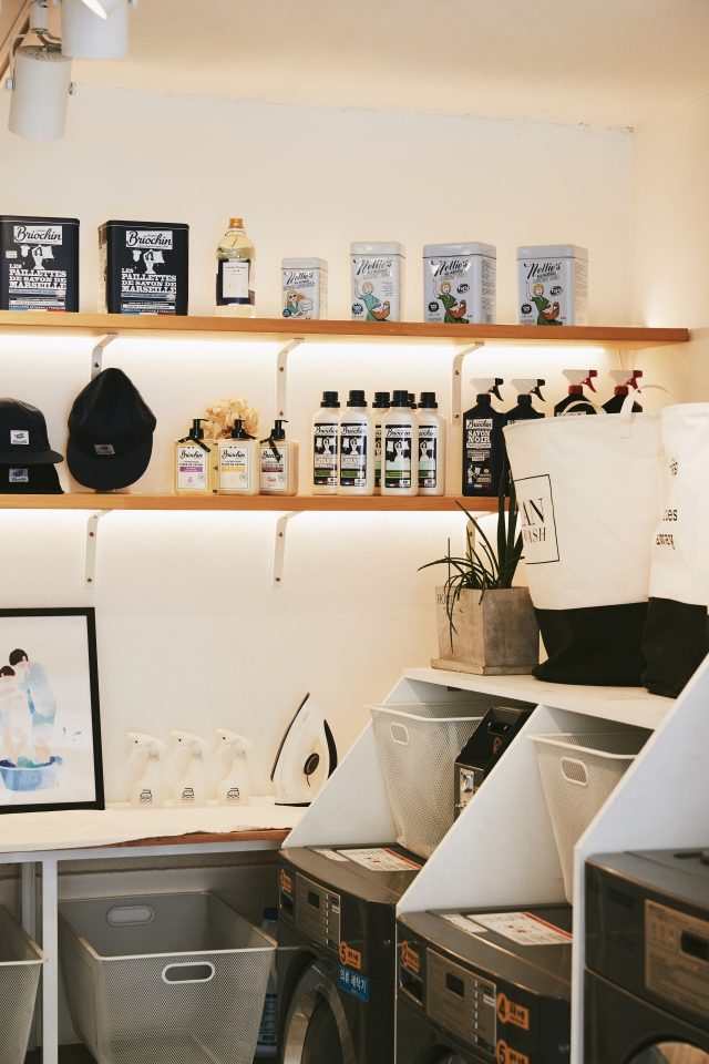 코인 빨래방은 그런 수고를 덜어주는 곳이지만 딱히 할 게 없어 시간이 붕 뜬다는 게 문제였다. “그 시간을 유용하게 쓸 수 있는 공간을 만들고 싶었어요.” 최소 30분의 시간을 유용하게 쓰는 데에는 여러 방법이 있다. 커피를 한잔하거나, 책을 한 챕터 읽거나, 쌓인 이메일 답장을 해치우거나, 멍하니 앉아 볕을 쬐거나, 친구를 만나 수다를 떨거나.
