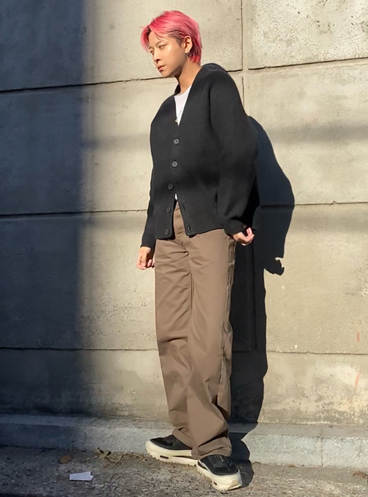 사계절 내내 계절에 상관없이 활용할 수 있는 아이템을 꼽자면 단연 카디건이죠. 카디건은 코지하면서도 편안한 분위기를 만들어주는 것은 기본. 추울 땐 걸치고 더울 땐 벗으면 되니까, 이만큼 실용적인 아이템도 없어요. 또한, 티셔츠, 재킷, 니트 등등 다양한 아이템과 매치할 수 있다는 장점도 있죠. 모델 주원대는 심플한 이너와 함께 매치해서 스타일링을 완성했네요. 찬바람이 불기 시작하는 요즘, 취향에 따라 때로는 아우터로, 때로는 이너로 카디건을 활용해보세요!