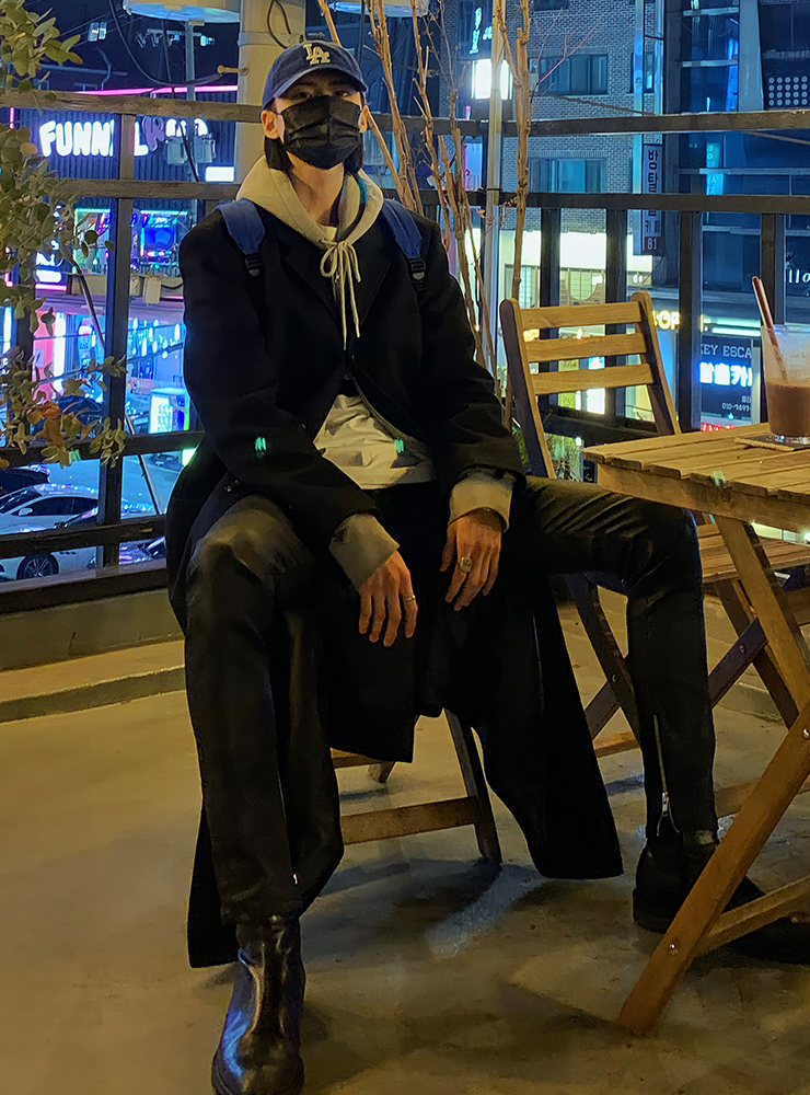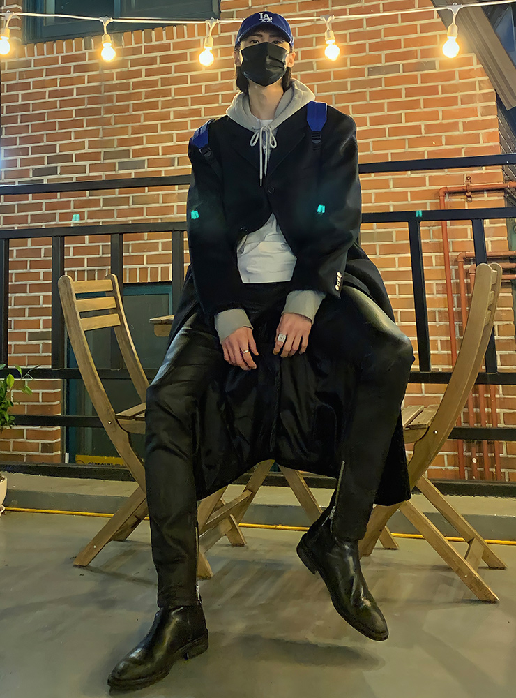 추운 겨울 자꾸만 따뜻해 보이는 어두운 컬러를 찾게 되는 경우가 있죠. 하지만 무채색 코디는 깔끔한 룩을 완성할 수는 있지만, 다소 아쉬운 느낌이 들 때가 있는데요. 이럴 땐 트렌드에 상관없이 언제나 사랑받는 블루 컬러를 매치해보면 어떨까요? 모델 손지호는 블랙과 그레이로 깔끔한 데일리룩을 완성한 뒤 여기에 블루 컬러의 아이템을 매치해 포인트를 주었는데요. 모자, 가방 같은 가벼운 액세서리들로 컬러를 맞춰 센스 있는 코디를 완성했네요. 이처럼 무채색 코디에 블루 컬러 아이템을 매치하면 컬러 자체만으로 드라마틱한 분위기를 자아낼 수 있을 거예요.