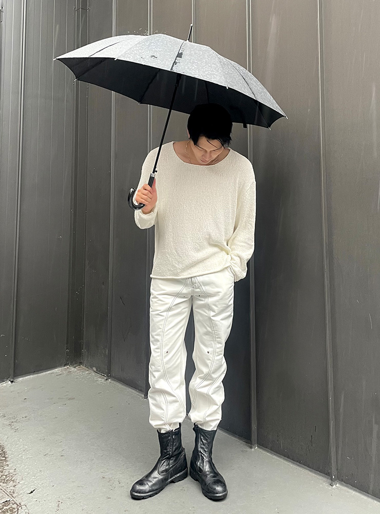 점차 날씨가 선선해지면서 니트 입기 좋은 계절이 됐죠. 이럴 땐 모델 변준서처럼 루즈한 핏의 니트로 코디를 완성해 보세요. 루즈한 핏의 니트는 꾸민 듯 안 꾸민 듯 내추럴한 멋은 기본. 편안하게 착용할 수 있죠. 모델 변준서는 차분한 무드를 주는 아이보리 컬러의 니트로 스타일링을 연출했어요. 하의는 소재감은 다르지만 밝은 계열로 착용해 통일감을 주었네요. 여기에 남성다운 느낌의 부츠를 매치한다면, 비 오는 날 완벽하면서도 세련된 스타일을 연출할 수 있을 거예요.