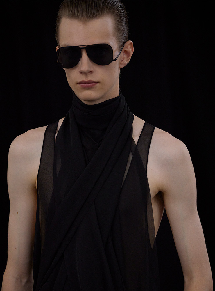흩날리는 긴 머플러와 볼륨감이 풍성한 소매 그리고 과감하게 힘을 준 어깨. 예상 밖의 가벼움과 날카로움이 남자의 아름다움을 새롭게 정의했다.