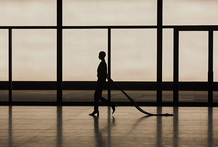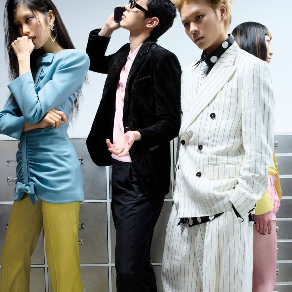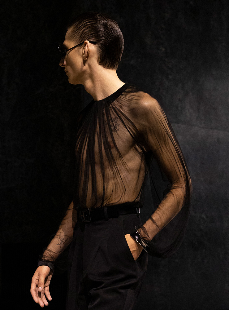 남성적 요소와 여성적 요소 사이의 자유로운 상호작용 그리고 새로운 형태의 추구. 안토니 바카렐로의 이러한 지향점은 곳곳에서 드러나는 맨살과 과감한 시스루 소재를 통해 구현되었다.