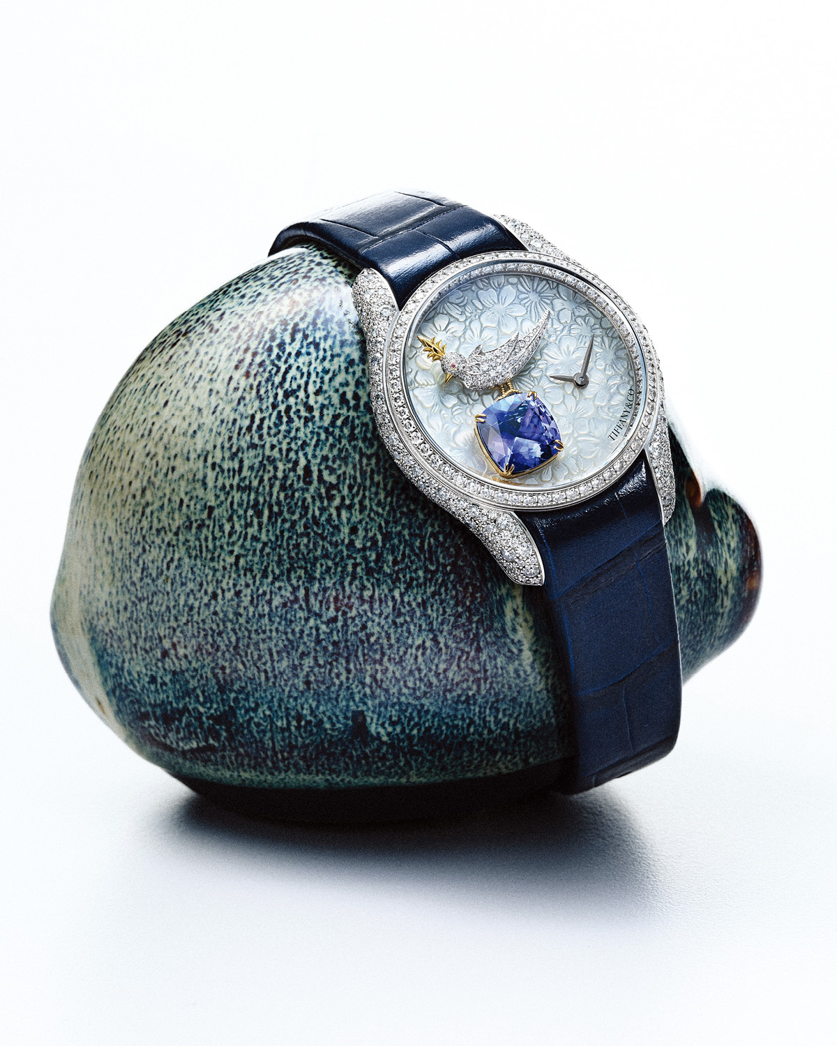 플로럴 패턴 MOP 다이얼 위에 2캐럿의 쿠션 컷 탄자나이트를 올렸다. 36mm 화이트 골드 케이스에 587개의 다이아몬드를 정교하게 세팅한 쟌 슐럼버제 바이 티파니 버드 온 어 락 레거시 워치 가격 미정 티파니.