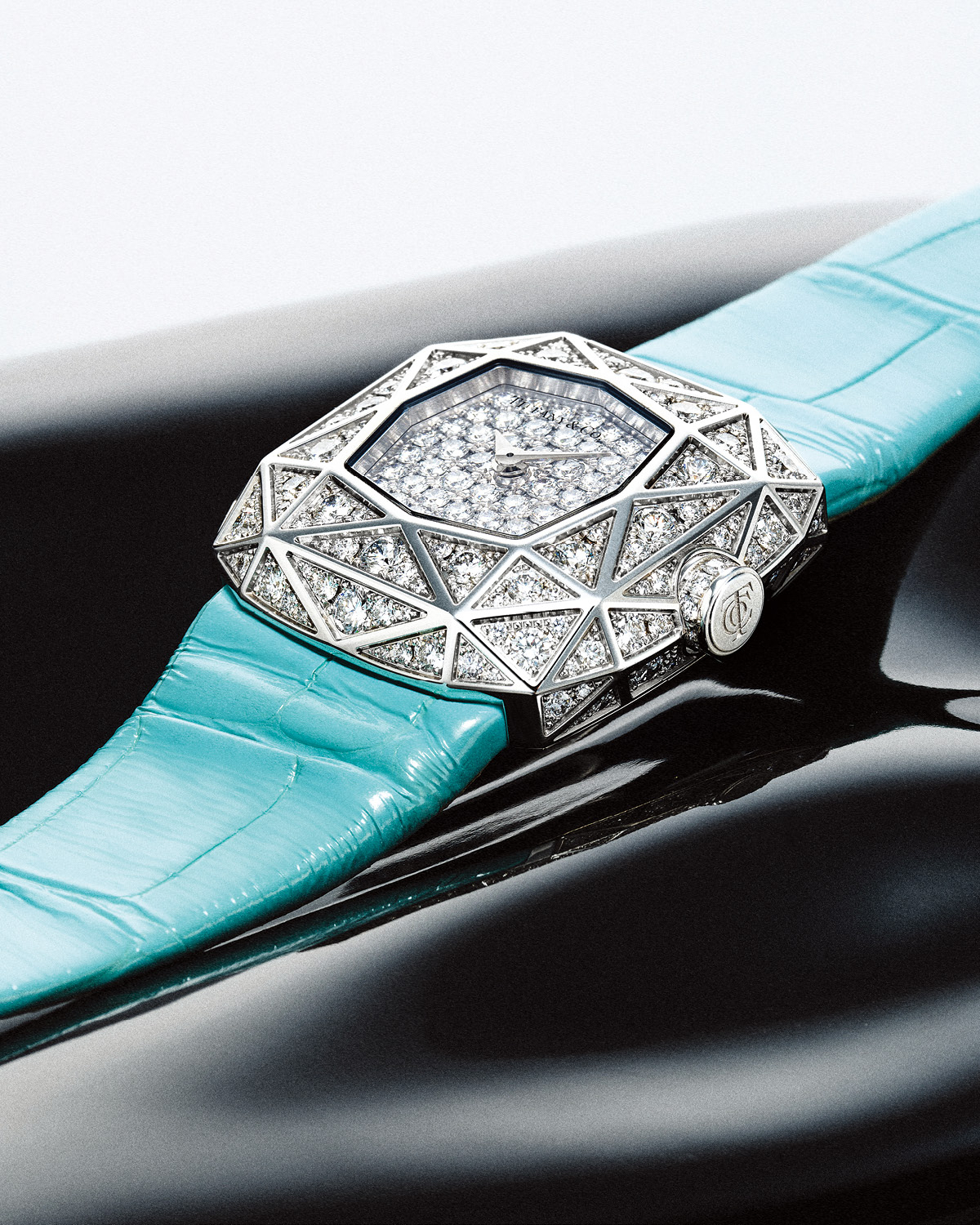 다이아몬드의 패싯을 형상화한 30mm 케이스에 총 2캐럿, 192개의 라운드 브릴리언트 다이아몬드를 장식했다. 캐럿 128 패싯 워치 가격 미정 티파니.