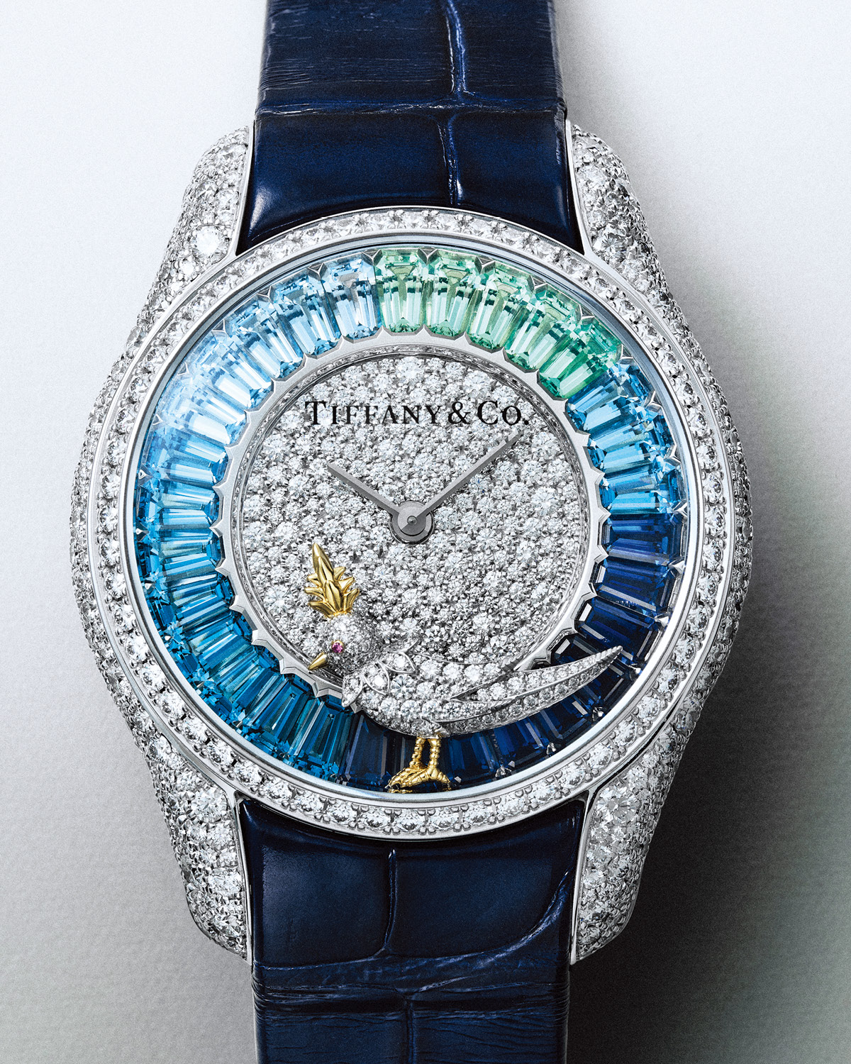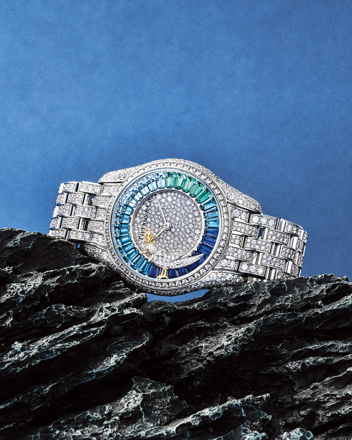 바게트 컷 사파이어와 에메랄드, 블루 토파즈를 그러데이션 세팅한 다이얼이 눈길을 끈다. 쟌 슐럼버제 바이 티파니 버드 온 어 락 워치 가격 미정 티파니.