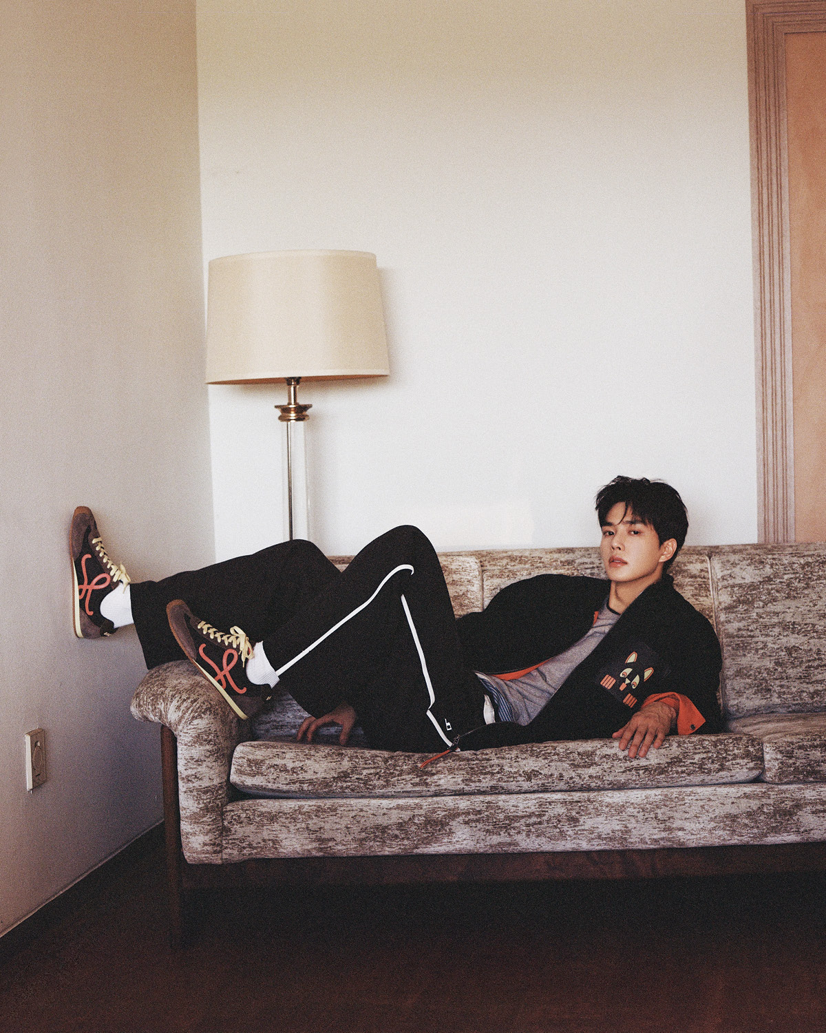 재킷, 티셔츠, 트레이닝팬츠, 슈즈 모두 로에베.
