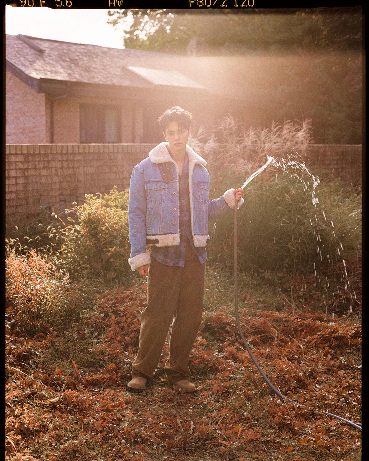 시어링 데님 재킷, 셔츠, 팬츠, 슈즈 모두 로에베.