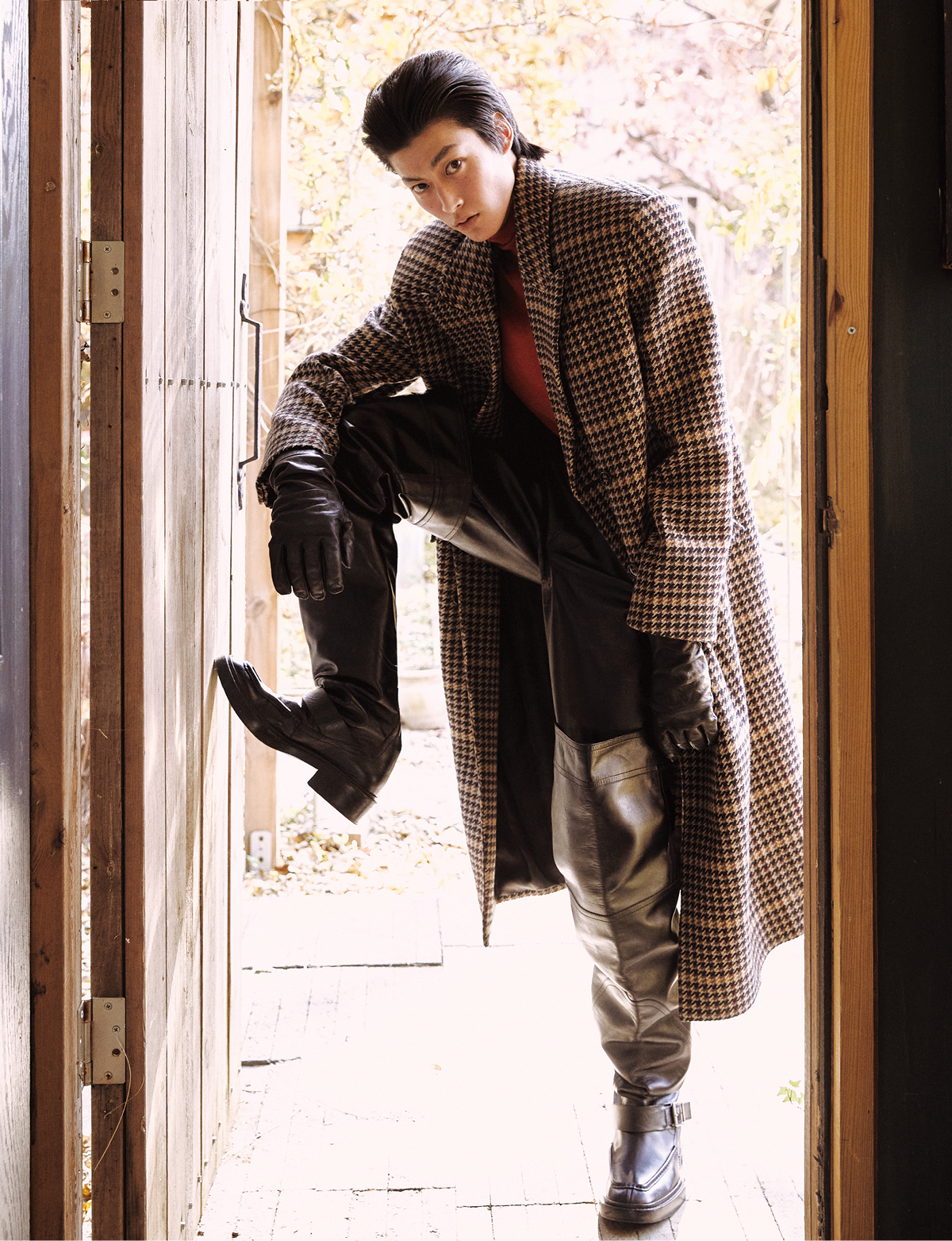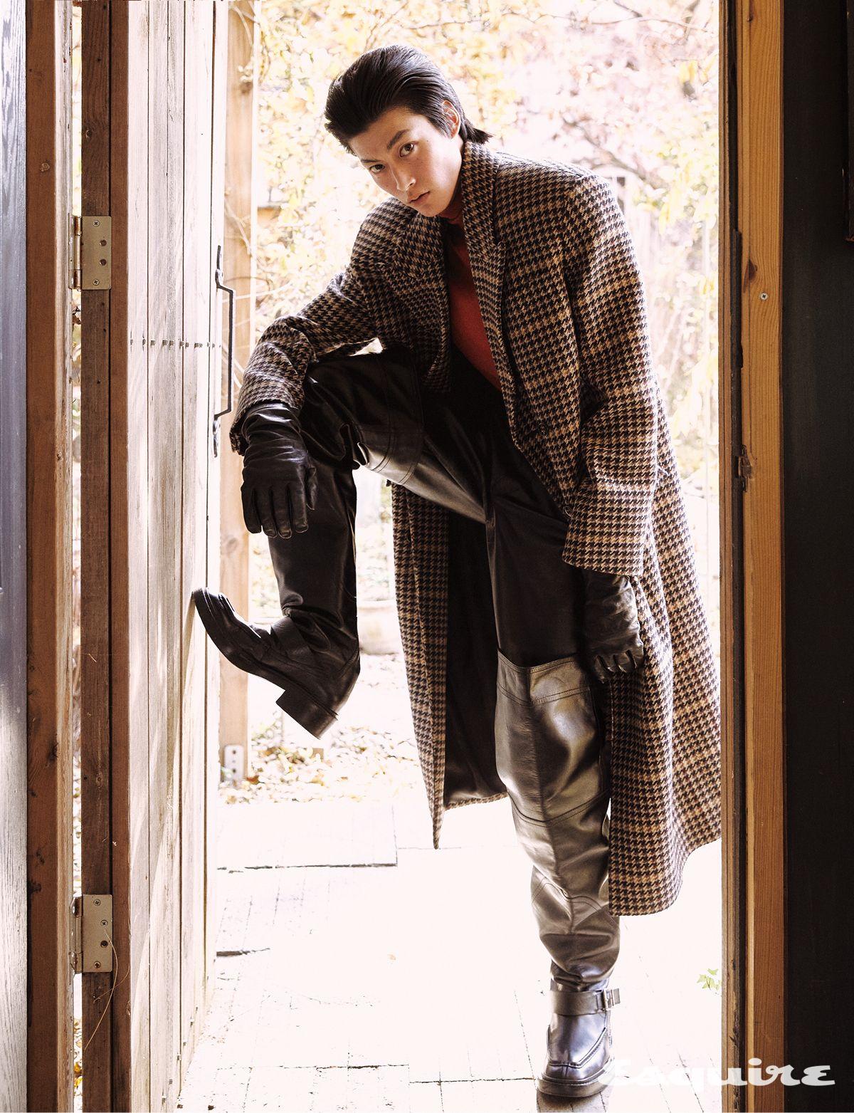 체크 코트, 터틀넥 톱, 레더 팬츠, 오버 더 니 부츠, 레더 글러브 모두 생 로랑 by 안토니 바카렐로.