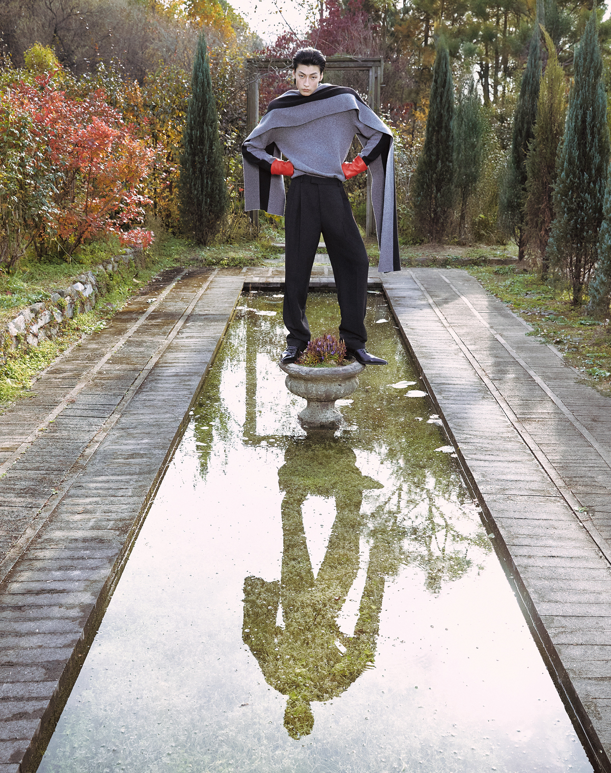 스웨터, 팬츠, 롱 스톨, 레더 글로브 모두 가격 미정 페라가모. 헤론 레이스업 부츠 가격 미정 맥퀸.