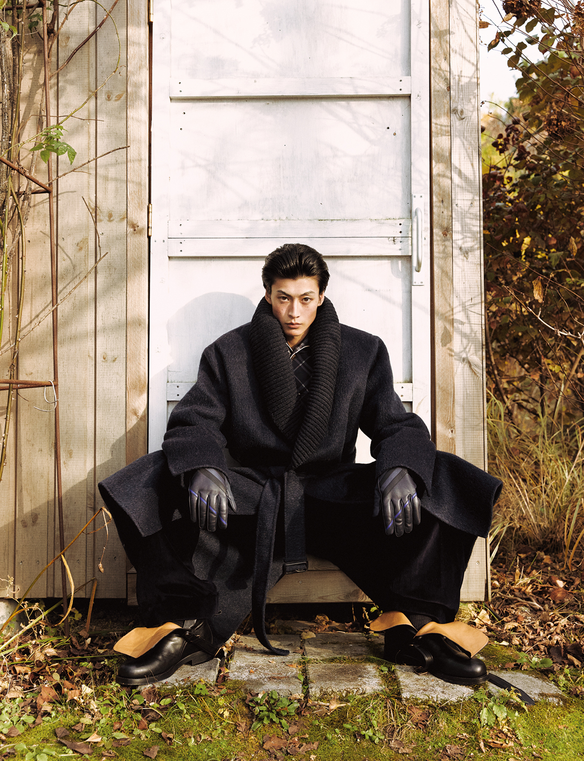 숄 코트, 실크 파자마 셔츠, 코듀로이 테일러드 팬츠, 레더 부츠, 체크 레더 글러브 모두 가격 미정 버버리.