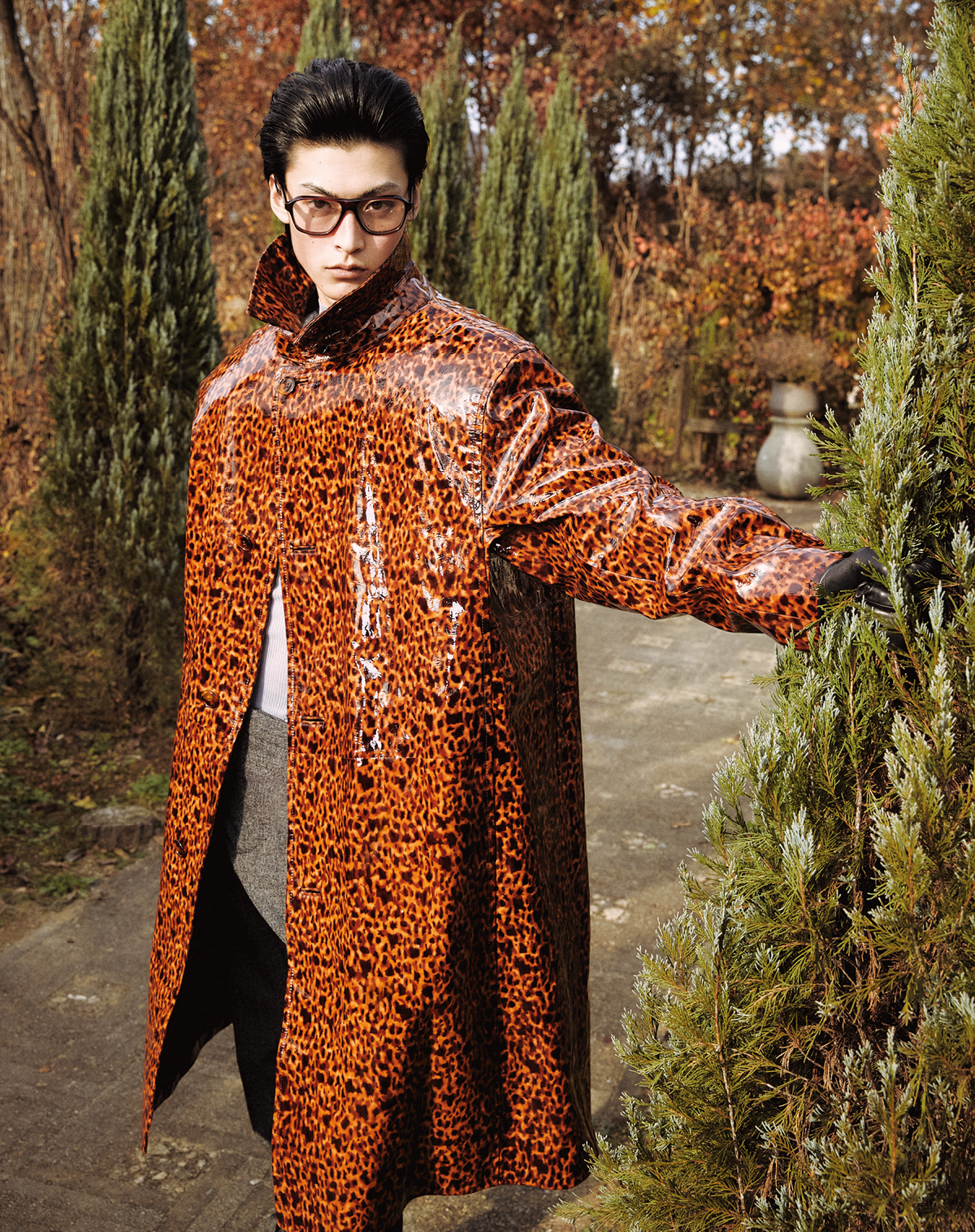 페이턴트 레더 코트, 터틀넥 톱, 울 팬츠 모두 가격 미정 구찌. 레더 글러브 가격 미정 생 로랑 by 안토니 바카렐로. 안경 54만2000원 올리버피플스 by 에실로 룩소티카.