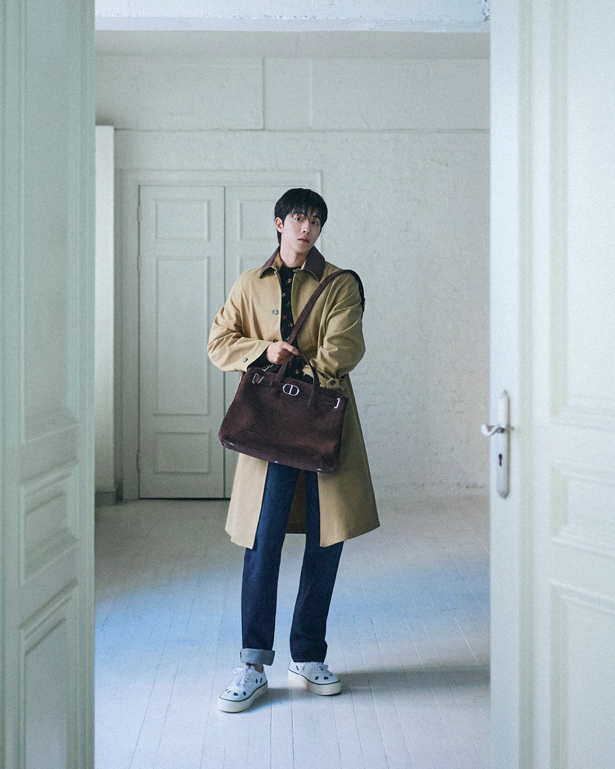 코튼 남성 트렌치코트, 플라워 엠브로이더리 남성 크루넥 스웨터, 레귤러 남성 데님 팬츠, 디올 솔트윈드 남성 스니커즈, 디올 노르망디 미디엄 남성 토트백 모두 디올.