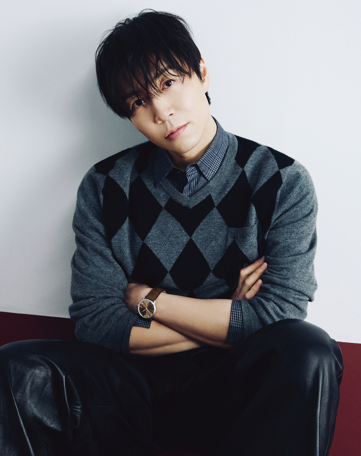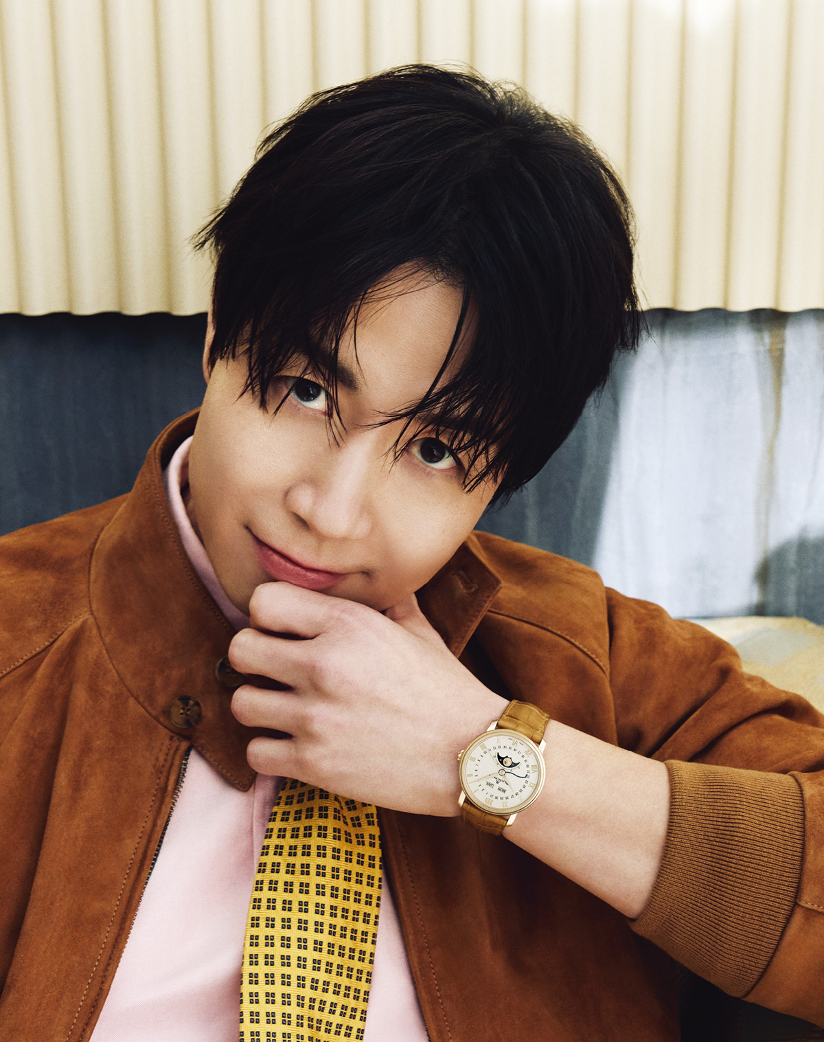 은은한 골든 브라운 다이얼과 리새틴 및 폴리싱 처리한 인덱스, 브라운 레더 스트랩이 조화롭다. 빌레레 울트라 슬림 1618만원 블랑팡. 니트, 셔츠, 팬츠 모두 페라가모.