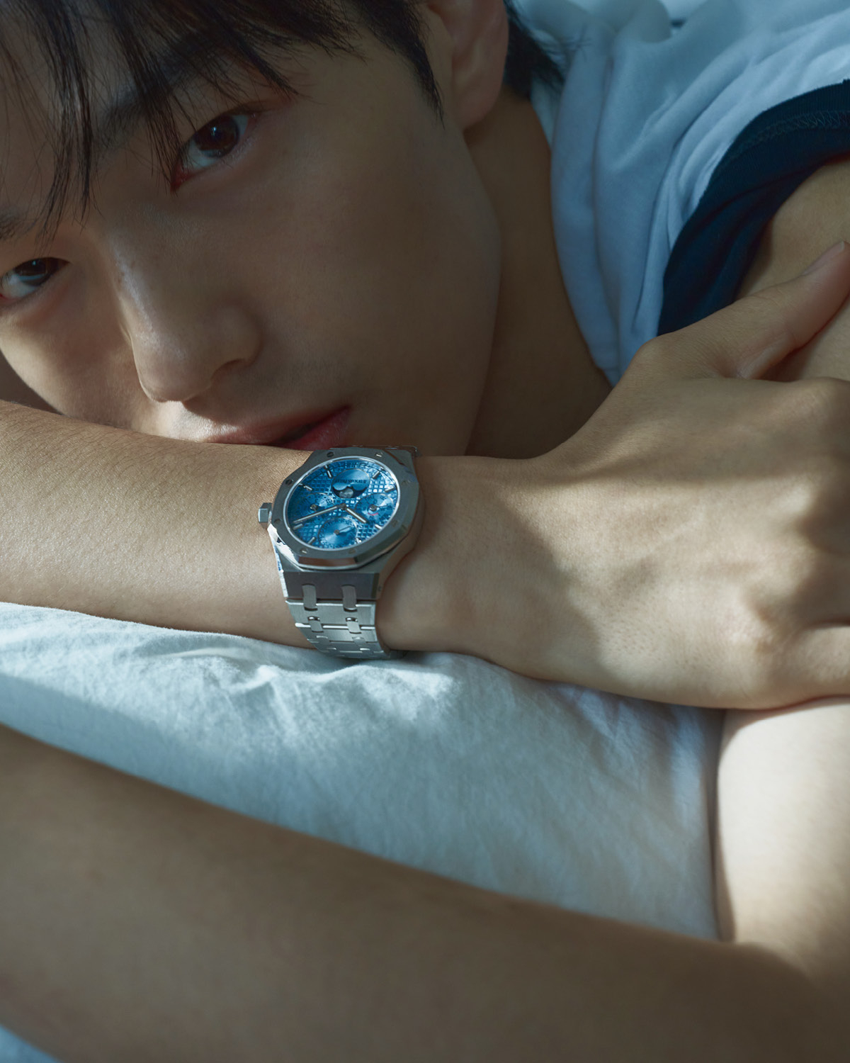 청명한 라이트 블루 PVD 그랑드 타피스리 다이얼이 돋보이는 로열 오크 셀프와인딩 퍼페추얼 캘린더 가격 미정 오데마 피게. 더블 레이어 화이트 티셔츠, 블랙 티셔츠 모두 가격 미정 셀린느.